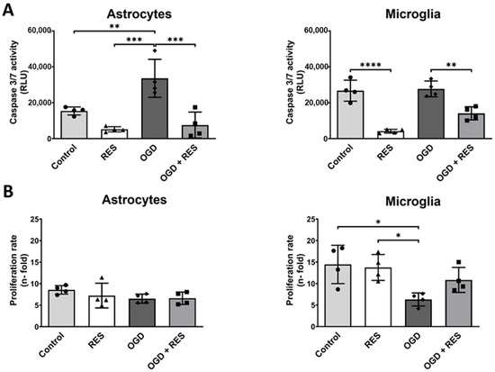 To further validate our OGD model, we tested the effects on the apoptosis and growth rate of the microglia and astrocytes. Therefore, the activity of the key effector caspases 3 and 7 was analyzed after 24 h. The caspase 3/7 activity luminescence assay indicated OGD induced doubled caspase activity levels in the astrocytes (p = 0.0094) and equal activity levels in the microglia (Figure 4A). The addition of resveratrol (100 µM) reduced the basal levels of caspase 3/7 activity under normoxic conditions, and also mildend the OGD-induced caspase 3/7 activity, even below the basal levels. This effect was most pronounced in the microglia (control ± resveratrol: p < 0.0001; OGD ± resveratrol: p = 0.0026).