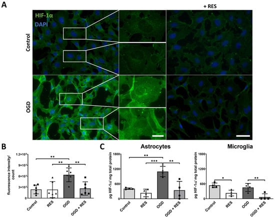The role of the HIF-1α pathway in oxygen regulation, energy metabolism, and survival have been investigated intensively. The accumulation of HIF-1α is known to be a direct outcome of hypoxia in cells [35,36]. In this study, OGD induced HIF-1α buildup in the astrocytes but not in the microglia. Previous studies [55] have shown an upregulation of HIF-1α also in the microglia. However, these studies used models with 0% oxygen; therefore, it seems that 3% oxygen, as used in this study, could still be sufficient for the microglia. This presents microglia to be less sensitive to lower oxygen concentrations than astrocytes. In relation to this result, Tadmouri et al. already found astrocytes to be activated more quickly, whereas the microglia required longer time spans of hypoxia to change to a reactive state [56]. Furthermore, resveratrol was able to inhibit the HIF-1α pathway, as previously shown in different studies focusing on cancer treatments [57,58].
