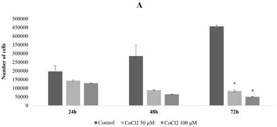 We also evaluated CoCl2’s effects on cell morphology by phase-contrast microscopy observations during treatment times. Twenty-four hours after treatment, the cell morphology was regular and comparable to untreated cells (Figure 1B), while morphological variations, characterized by a flattened shape and cytoplasmic extensions, signs of cell stress, were visible at 48 and 72 h after treatments with both concentrations of CoCl2.
