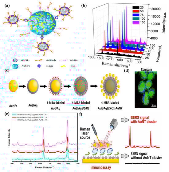 Figure 2 illustrates analytical studies based on the detection of analytes using SERS-based immunoassays. Figure 2a demonstrates a schematic illustration of the sandwich immunoassay used to determine human IgG in samples [90]. To obtain such an assay, Song et al. mixed SERS tags with SERS immuno-GMNPs, followed by human immunoglobulin G (IgG) antigens. Next, it was necessary to leave the sample for incubation for 3 h and then rinse it three times with borate buffer solution (BBS), after separating everything with a magnet. To carry out SERS measurements, the sample had to be diluted with water. To check how the Raman spectra of golden mesoflowers (Au MFs) change depending on the increase in the volume of 4-Mercaptobenzoic acid (4-MBA), SERS measurements of five samples were carried out, in which 25, 50, 75, 100, and 150 µL of 1 mM 4-MBA were added to 1 mL of Au MFs. The results of these measurements are presented in Figure 2b [90]. According to these spectra, it can be noted that with the changes in the volume of 4-MBA, there are similar shifts of signals, but nevertheless, the intensity of the peaks is significantly different. Figure 2b illustrates that when adding 150 µL of 1 mM 4-MBA to Au MFs, the signal was more intense than in those samples in which 25 µL of 1 mM 4-MBA was added. Song et al. presented their work in which the detection of Human IgG was performed using SERS-based immunoassays, and the limit of detection for this work was equal to 6.7 × 10−18 M. An illustration of the process of forming core–shell–satellite nanoassemblies (Au@Ag@SiO2–AuNP nanoassemblies) is shown in Figure 2c [92]. To do this, gold nanoparticles with a diameter of 50 nm were covered with a layer of silver. Next, the 4-MBA was attached to the AuNP with a silver-coated layer. To stabilize the solution, 4-MBA-labeled Au@Ag particles were coated with a layer of silicon oxide SiO2 using the Li process. A thin layer of silicon oxide (5 nm) increases the stability of the compound and endows a great surface enhancement. Satellite AuNPs were applied to the surface of the complex, which enhance electromagnetic coupling and the SERS effect. In addition, this step helps to improve the biological detection of analytes. The energy-dispersive X-ray spectroscopy (EDS) mapping of Au@Ag@SiO2–AuNP nanoassemblies is presented in Figure 2d [92]. It contains an image of Au@Ag@SiO2–AuNP nanoassemblies used for the detection of alpha-fetoprotein (AFP). This work was found to be the most sensitive among the abovementioned analytical papers, and its LOD of AFP was equal to 4.4 × 10−18 M. According to the image, the main density of gold was found in the inner part; for silver, it was closer to the outer border, while in silicon it was evenly distributed throughout the sample in a relatively small concentration. To check the dependence between the thickness of this sensor’s silver coating layer and the intensity of the Raman signal, SERS measurements were carried out, the results of which are presented in Figure 2c [92]. The volumes of silver nitrate (AgNO3) added to the sensor were 50, 150 and 300 µL, and the thickness of the silver layer was more than 3.5 nm. According to the results of the SERS measurements, the intensity of the peaks of 4-MBA-labeled cores increased in accordance with an increase in the thickness of the silver layer. The quantitative characterization of the adiponectin scheme is presented in Figure 2f [88]. Kim et al. presented an analytical paper with a limit of detection equal to 1.0 × 10−17 M. Here, the analyte, adiponectin, is sandwiched between monoclonal capture antibodies on the substrate and monoclonal antibodies attached to a gold nanotriangle nanotag. With an increase in the amount of adiponectin, anisotropic gold nanotriangles (AuNTs) with Raman reporters formed clustered structures, which contributed to the enhancement of the SERS effect. Accordingly, the lower the concentration of the desired protein, the worse the intensity of the peaks that were presented as a result of the analysis.