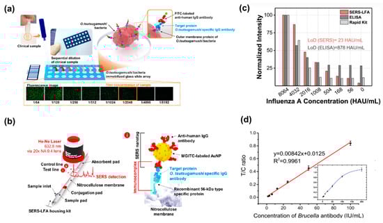 The detection of the O. tsutsugamushi-specific IgG antibody showed comparatively high performance in terms of the mentioned parameters in the clinical application of fluorescence immunoassays, the process of which is illustrated in Figure 3a: the O. tsutsugamushi bacteria were pre-immobilized on the array well surface, with the following dilution titer of the serum sample placed in each well [122]. The antibodies were then captured by the bacteria on the surface. To form a sandwich complex by antibody–antibody interaction, fluorescein isothiocyanate (FITC)-labeled antihuman IgG antibodies were added and antibody titer values were determined using the fluorescence microscope images, the clinical serum of which was serially diluted. This serial dilution weakens the intensity of the fluorescence. The figure demonstrates the usage of fluorescence microscopic images to visualize the titer values, as the end point is taken whenever it is impossible to observe the titer value visually. Thereby, the challenges associated with the fluorescence microscope diagnosis are addressed in SERS-LFA detection, the working scheme of which was presented by Lee et al. For the sensitive diagnosis of scrub typhus, the specificity of the target antibody was increased by synthesizing an O. tsutsugamushi recombinant protein instead of using bacteria. As shown in Figure 3b, this 56 kDa protein was synthesized using strains such as Karp, Kato, and a Gilliam, immobilizing them on the test line of the LFA strip [122]. Another example of achieving better performance in detection is represented in Figure 3c. A 40-fold improvement in sensitivity was observed for SERS-LFA in comparison with the ELISA method, the LODs of which are 23 HAU/mL and 880 HAU/mL, respectively [121]. Figure 3d also outlines the performance of TF-LFIA for the detection of the Brucella antibody, with a linear range of 1.6–100 IU/mL and an LLOQ of 1.6 IU/mL [124].