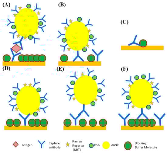 Schematic representation of specific and non-specific binding. (A) specific, (B,D–F) various kinds of non-specific (NS) nanotag binding that can produce SERS signals, (C) capture antibody NS binding to the substrate and blocking buffer (not to scale).