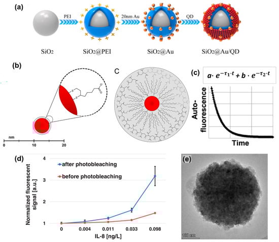 The solutions for fluorescence-based immunoassays used to improve the detections. (a) The schematic representation of how dual-functional SiO2@Au/QD fluorescent labels are fabricated. Adopted with modifications from Han et al. [52] Copyright © 2022 Elsevier B.V. (b) The scheme of QD operation by the ligand exchange, with dihydrolipoic acid on the left, and the QD coated with an amphiphilic polymer. Adopted with modifications from Esteve-Turrillas et al. [147] Copyright © 2013 Elsevier B.V. (c) The two-exponential model for fitting the photobleaching decay curve. Adopted with modifications from Roth et al. [146] Copyright © 2019 Elsevier B.V. (d) The graph of the measured LOD of the Interleukin-8 (IL-8) immunoassay with the dose–response curves, red and blue colors indicating the before and after of photobleaching the beads, respectively. Reused with modifications from Roth et al. [146] Copyright © 2019 Elsevier B.V. (e) The TEM image for the CDs@CaCO3 nanocomposite. Reused from Dong et al. [41] Copyright © 2021 Elsevier B.V. All permissions to use copyrighted images were obtained.