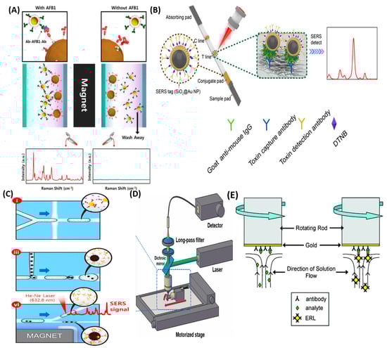 A schematic representation of the SEHGNs and magnetic beads-based sensor is presented in Figure 6A [108]. Ko et al. presented a sensor for the detection of aflatoxin 1 (AFB 1) with an LOD of 3.2 × 10−10 M, and a detection time of less than 30 min. Anti-AFB1s and anti-ATB1 are two types of antibodies that were used to form this sandwich immunocomplex for the detection of AFB1. In the presence of an analyte, these anti-AFB1-conjugated SEHGNs and ATB1-conjugated magnetic beads form an antibody–antigen–antibody sandwich complex, and as can be seen in Figure 6A, a similar complex is not formed in the absence of an analyte (AFB1). Figure 6B shows the analysis process using toxin-specific SERS–LFIA strips based on SiO2@AuNPs [95]. These strips provide the opportunity to shorten the analysis time to 15 min, without impairing the method’s sensitivity. The LODs of this method for detecting ricin, SEB, and BoNT/A, respectively, were 1.54 × 10−12 M, 1.79 × 10−12, and 6.67 × 10−12 M. These analytes, in turn, are biological warfare agents, and due to the lethality of low doses of these compounds, rapid detection during their analysis is necessary. An approximate schematic representation of individual parts of the microdroplet channel filled with red ink is presented in Figure 6C [91]. This device was created for the detection of Yersinia pestis F1 antigen and is quite sensitive, since the LOD of this method is 3.85 × 10−12 M. According to more detailed diagrams, it is possible to note the parts of the microdroplet channel that are responsible for droplet generation, droplet merging, and droplet splitting. Thanks to the use of this multifunctional microfluidic platform, the detection time was reduced to 10 min. This method allows for efficient immunoreactions and wash-free detection, and can also be used for the detection of hazardous materials, since the analysis is carried out automatically in an isolated platform system. Spiral scanning spectrometry is another type of analysis that allows the user to speed up analysis time and improve the method’s sensitivity. As shown in Figure 6D, practically nothing has changed in terms of detection, and the main difference from the traditional method of analysis is that the substrate is attached to the rotor with double-sided tape [155]. During the analysis, the motor rotates the substrate at a speed of 600 rpm, allowing the entire area of the substrate to be analyzed. This method was used to reduce the optical damage, so that the damage done to the sample in such an analysis is less than in conventional types of analyses. This method can be used for the rapid quantitative analysis of hazardous or toxic compounds. Figure 6E illustrates the application of the rotating substrate method in the preparation of immunoassay samples for SERS detection by Porter’s group. In this method, a gold film-coated substrate is modified with linker molecules, such as dithiobis (succinimidyl propionate) (DSP). Then, the substrate is mounted on a rotating rod, modified with capture antibody, and blocked with a blocking buffer. Each step occurs within several minutes, not several hours, as occurs in a typical stagnant assay. When the rod with the substrate attached to it starts to rotate at the next step, an antigen/analyte (the rabbit IgG) would diffuse quickly to the capture substrate and would bind to antigen. Finally, at the last stage before drying, the substrate is washed in the ERL (nanotag) solution, while being rotated on a rod at a controlled speed. This method allows for a significant reduction in the immunoassay time from more than several hours to 25 min, without any decrease in its sensitivity, and a 10+ fold improvement in efficiency. In addition to a large improvement in assay time, the reported rotating substrate procedure reduced non-specific binding, and therefore improved the assay’s selectivity [153].