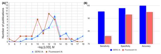 The 30 analytical papers per detection method (30 for SERS and 30 for fluorescence) were used to calculate the median and geometric mean of the LOD values. The distribution of these 60 analytical publications by −log[LOD] is shown in Figure 7A. The comparison demonstrates that assays that use SERS detection are generally more sensitive, since their median and geometric mean for LOD were 4.3 × 10−13 M and 5.4 × 10−13 M, respectively, as compared to 1.5 × 10−11 M and 2.8 × 10−11 M for fluorescent methods. There are eight ultra-sensitive reports (LOD ≤ 10 fM) for SERS IAs and only three ultrasensitive reports, with LOD ≤ 10 fM (rounded up), for IAs with fluorescence-based detection.
