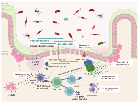 Gliadin peptides can then translocate, either via the paracellular or transcellular route [17], to the intestinal lamina propria, the layer of loose connective tissue located under the epithelial layer, and are deamidated by tissue transglutaminase 2 (TG2), an enzyme that converts glutamine amino acids to glutamate (or glutamic acid) residues [18]. Deamination by TG2 improves the binding affinity of gliadin peptides to the HLA-DQ2 and/or DQ8 heterodimers in antigen-presenting cells (APCs), such as dendritic cells [19]. The HLA-gliadin peptides complex is then presented to CD4+ T helper cells that recognize it via their cell surface T cell receptors (TCRs) [20,21]. Once activated, these cells can differentiate into Th1/Th17 subsets and release pro-inflammatory cytokines, such as interferon-gamma (IFN-γ), tumor necrosis factor-alpha (TNF-α) and interleukin-17 (IL-17), causing an adaptive immune response that leads to mucosal damage characterized by villous atrophy, crypt hyperplasia and infiltration of intraepithelial lymphocytes (IELs) [22]. T-cells response can also activate and promote the differentiation of B cells into plasma cells that secrete antibodies against deamidated gliadin peptides and the self-antigen TG2 [23], both hallmarks of celiac disease that are used to diagnose it.
