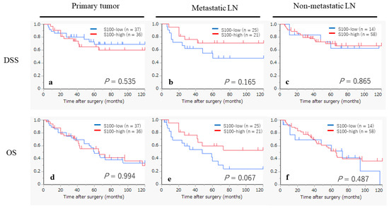 The Kaplan–Meier curves, based on the status of the S100-DC infiltration, are displayed in Figure 3. In the metastatic LNs, the S100-high group appeared to show a favorable prognosis in terms of the DSS and OS, although statistical significance was not reached (p = 0.165, p = 0.067, respectively). However, no tendency was observed in the analysis of the DSS for the primary tumors (p = 0.535) and non-metastatic LNs (p = 0.865), or in the analysis of the OS for the primary tumors (p = 0.994) and non-metastatic LNs (p = 0.487).