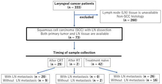 A total of 333 patients with laryngeal cancer treated at Saga University Hospital between 2000 and 2020 were initially enrolled in this study. Among these, cases without lymphadenectomy or lymph node biopsy, and those with histological types other than squamous cell carcinoma were excluded. Finally, 73 patients were enrolled (Figure 4). Comprehensive informed consent for the use of resected tissue for this research was obtained from all patients, and the study protocol was approved by the Ethics Committee of Saga University (2023-02-R-09).