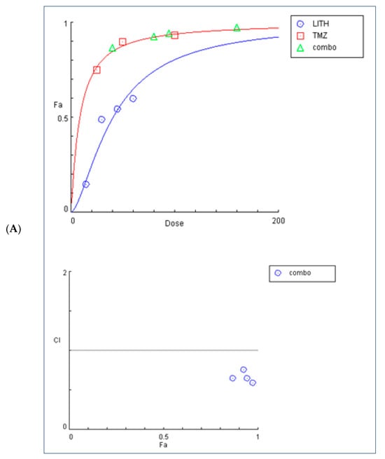 The graphical representation of the combined effect of 9″-lithospermic acid methyl ester and TMZ is also shown through dose–effect curves and combination–index plots generated using CompuSyn software for the U87 and T98 cell lines (Figure 7). For each combination of compounds, CompuSyn calculates the dose reduction index, where it can take values of DRI > 1 and <1, indicating favorable and unfavorable dose reduction, respectively, and DRI = 1, indicating no dose reduction. As shown in Figure 8 in both the U87 (A) and T98 (B) cell lines, combinations of the above substances show a favorable dose reduction (DRI > 1).