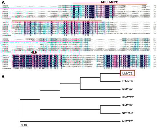 Analyzing the sequence of IbMYC2. (A). Alignment of the IbMYC2 sequence with its homolog sequences from other plants, highlighting the conserved amino acids (aa) in distinct colors. The preserved bHLH-MYC and HLH domains are dented by the continuous and discrete red lines, respectively. The similarities of the sequences are represented in black, red, and blue backgrounds. Plant species include Ipomoea batata (Ib), Ipomoea trilobal (Itb), Solanum lycopersicum (Sl), Sesamum indicum (Si), Nicotiana tabacum (Nt), Hevea brasiliensis (Hb), and Arabidopsis thaliana (At). (B) Phylogenetic analysis of IbMYC2 from different plants utilizing the neighbor-joining method in MEGA 6.0 with 1000 bootstrap iterations. IbMYC2 is marked using a red box.
