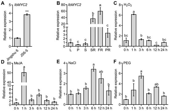 Analysis of IbMYC2 expression level. (A) Analysis of IbMYC2 mRNA level in the storage roots of Jingshu 6 and JS6-5. The expression in Jingshu 6 was defined as “1”. ** p < 0.01; Student’s t-test. (B) Relative mRNA level of IbMYC2 across various tissues in JS6-5, including leaves (L), petioles (P), stems (S), storage roots (SR), fibrous roots (FR), and pencil roots (PR). The expression in leaves was defined as “1”. (C–F) Expression analysis of IbMYC2 in JS6-5 over various time intervals (h) following exposure to hydrogen peroxide (H2O2) (100 mmol/L), methyl jasmonate (MeJA) (100 μmol/L), NaCl (200 mmol/L), and polyethylene glycol (PEG)6000 (20%). The expression level at 0 h for each treatment was defined as “1”. As an internal reference, the ACTIN gene of sweet potato is utilized. The data are shown as mean values ± SD (n = 3). The different lowercase letters denote statistically significant deviations according to one-way ANOVA (Tukey test) at probability levels of p < 0.05.
