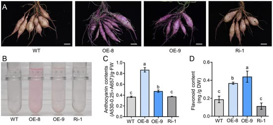 IbMYC2 contributes to the modulation of anthocyanin accumulation. (A) The skin color of the storage roots in IbMYC2-OE, IbMYC2-Ri, and WT plants after four months’ growth in the field (Bars for 5 cm). (B,C) The determination of anthocyanin content in the storage roots of IbMYC2-OE, IbMYC2-Ri, and WT plants. (D) The determination of flavonoid content in the storage roots of IbMYC2-OE, IbMYC2-Ri, and WT plants. The data are shown as mean values ± SD (n = 3). The different lowercase letters denote statistically significant deviations according to one-way ANOVA (Tukey test) at probability levels of p < 0.05.