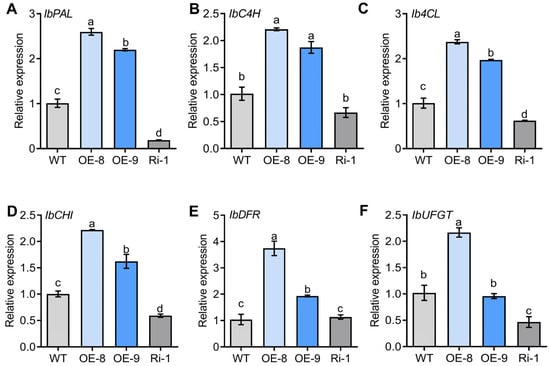 To better understand the cause of IbMYC2 affecting anthocyanin accumulation, the expression level of anthocyanin biosynthesis-related genes was analyzed by RT-qPCR in the storage roots of IbMYC2-OE, IbMYC2-Ri, and WT plants. The experimental data displayed that the expression levels of IbPAL, IbC4H, Ib4CL, IbCHI, IbDFR, and IbUFGT of IbMYC2-OE plants were considerably elevated compared to WT and IbMYC2-Ri plants (Figure 5). Further analysis displayed that these genes were expressed more highly in the skin than in the flesh (Figure S3). These data indicate that IbMYC2 might mainly escalate anthocyanin content by upregulating the expression of structural genes related to anthocyanin synthesis in sweet potato storage roots.