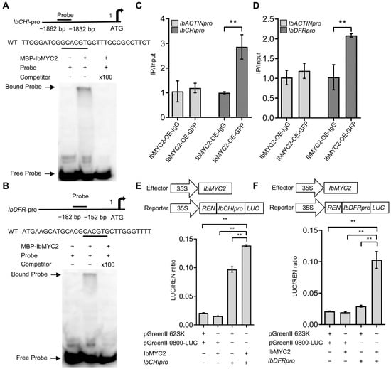 IbMYC2 activates the transcriptional activity of IbCHI and IbDFR. (A,B) Electrophoretic mobility shift assays (EMSAs) illustrated the binding of IbMYC2 to the G-box in IbCHI and IbDFR promoters in vitro. (C,D) Chromatin immunoprecipitation (ChIP)–qPCR assays, employing 35S: IbMYC2-GFP and 35S: GFP plants applied with anti-GFP antibody, demonstrated the in vivo binding of IbMYC2 to the IbCHI and IbDFR promoters. Green fluorescent protein is abbreviated as GFP. The control is the ACTIN promoter. The data are shown as mean values ± SD (n = 3). The symbol ** denotes statistically significant deviations from 35S: GFP at p < 0.01 according to Student’s t-test. (E,F) Dual-luciferase (Dual-LUC) assays revealed that IbMYC2 activated the transcriptional activity of IbCHI and IbDFR in protoplasts. The data are shown as mean values ± SD (n = 3). The symbol ** denotes statistically significant deviations at probability levels of p < 0.01 according to Student’s t-test.