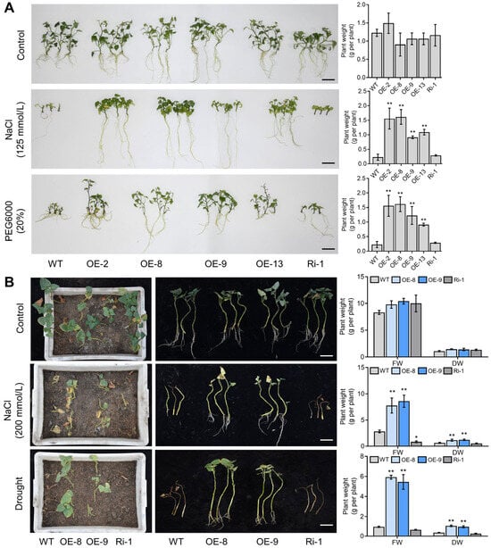 IbMYC2 positively promotes salt and drought stress tolerance in sweet potato. (A) Phenotypes of IbMYC2-OE, IbMYC2-Ri, and WT plants cultivated on Murashige and Skoog (MS) Medium without stress (control), with NaCl (125 mmol/L), or PEG6000 (20%) treatment for 4 weeks (Bars for 5 cm). (B) Phenotypes of IbMYC2-OE, IbMYC2-Ri, and WT plants grown in transplanting boxes without stress (control), with NaCl (200 mmol/L), or drought treatment (Bars for 10 cm). Fresh weight (FW) and dry weight (DW) are noted. The data are shown as mean values ± SD (n = 3). The symbols * and ** denote statistically significant deviations from WT at probability levels of p < 0.05 and p < 0.01, respectively, according to Student’s t-test.
