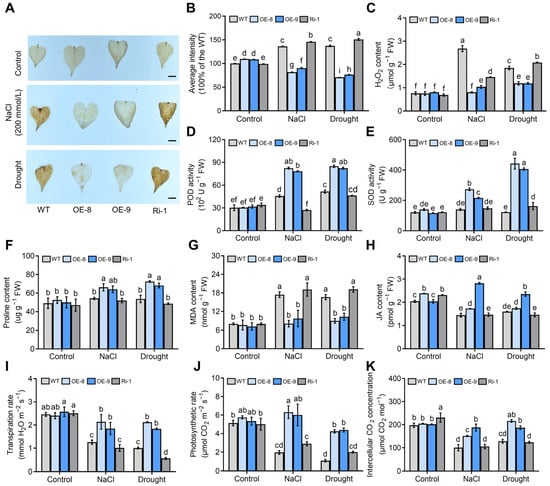 To determine whether ROS-scavenging levels were changed in the transgenic plants, we performed DAB histochemical staining and determination of H2O2 concentration on the transgenic plants (OE-8, OE-9, and Ri-1) and WT plants subjected to salt or drought stress. Under salt or drought treatment, the IbMYC2-OE plants had less intense DAB staining and accumulated less H2O2, while the IbMYC2-Ri plants had more intense DAB staining and produced more H2O2, compared to WT plants (Figure 8A–C). Furthermore, IbMYC2-OE plants demonstrated enhanced activities of peroxidase (POD) and superoxide dismutase (SOD); proline and jasmonic acid (JA) content; and transpiration rate, photosynthetic rate, and intercellular CO2 concentration, as well as decreased malondialdehyde (MDA) content. In contrast, the corresponding physiological indices in IbMYC2-Ri plants show opposite or no significant differences (Figure 8D–K).