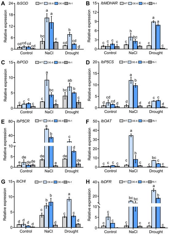 IbMYC2 positively activates abiotic stress-responsive genes under both salt and drought conditions. Expression levels of (A–C) ROS scavenging-related gene IbSOD (superoxide dismutase gene), IbMDHAR (monodehydroascorbate reductase gene), IbPOD (peroxidase gene), (D–F) the proline synthesis-related gene IbP5CS (pyrroline-5-carboxylate synthase gene), IbP5CR (pyrroline-5-carboxylate reductase gene), and IbOAT (ornithine aminotransferase gene) and (G,H) the anthocyanin biosynthesis-related gene IbCHI, IbDFR were performed using the leaves of IbMYC2-OE, IbMYC2-Ri, and WT plants without stress (control), with NaCl, or drought treatment for 2 weeks. The expression level of WT under control is defined as “1”. The data are shown as mean values ± SD (n = 3). The different lowercase letters denote statistically significant deviations at probability levels of p < 0.05 according to two-way ANOVA (Tukey test).