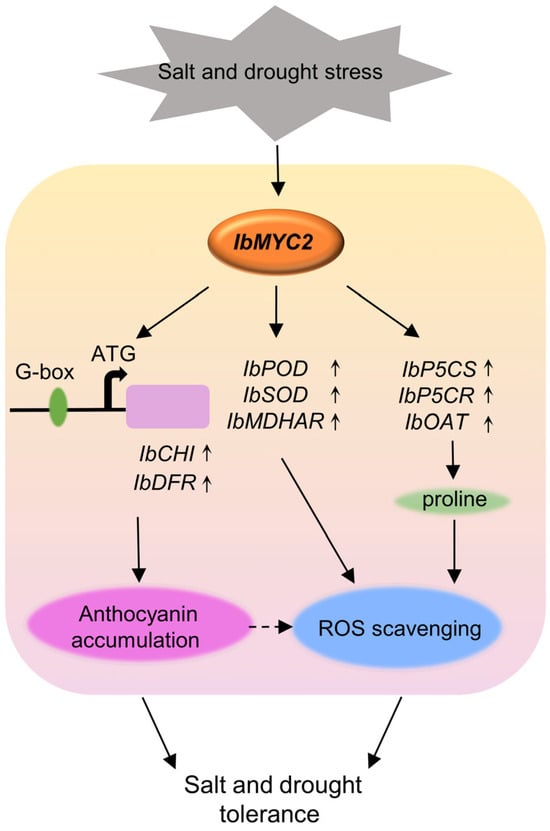 Under abiotic conditions, the accumulation of ROS will markedly escalate in plants, leading to severe oxidative harm to cells, which in turn minimizes enzyme activity and affects photosynthetic apparatus, ultimately impacting plant growth and development []. Plants have evolved a complex ROS-scavenging mechanism by activating a series of enzymatic (such as SOD [], MDHAR [], and POD []) and non-enzymatic antioxidant defenses to maintain cellular ROS homeostasis []. Proline also plays a pivotal role in decreasing ROS accumulation and sustaining the redox balance of cells under abiotic stresses []. In this study, under salt or drought stress, indices of abiotic stress tolerance were dramatically changed in the IbMYC2 transgenic plants (Figure 8). The abiotic stress-responsive genes were markedly upregulated in IbMYC2-OE plants and downregulated in IbMYC2-Ri plants in comparison with WT plants (Figure 9). These findings depict that IbMYC2 can elevate salt and drought tolerance by the pathway of ROS-scavenging and proline synthesis, thereby protecting plants from damage (Figure 10).