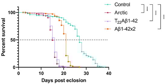 A common method to investigate proteotoxicity in Drosophila is to perform a survival assay where the median survival time (day when 50% of all flies are dead) is compared between flies expressing the proteotoxic protein and control flies [18,23,35]. Therefore, to investigate the proteotoxic effect of expressing Aβ in the enterocytes of the fly’s digestive tract, a lifetime analysis was performed. Data from this experiment showed that all Aβ-expressing flies had a significantly reduced longevity compared to the control flies (Figure 1); Arctic-, T22Aβ1–42-, and Aβ1–42 × 2 flies received a reduction in median survival time of 12 (p < 0.0001), 11 (p < 0.0001), and 6 (p < 0.0001) days, respectively. The median survival times for Arctic-, T22Aβ1–42-, Aβ1–42 × 2-, and control flies were 15, 16, 21, and 27 days, respectively, revealing that expression of Aβ in the fly gut resulted in toxic effects that reduced the lifetime of the fly. Moreover, a significant difference in the longevity between Aβ1–42 × 2 flies and the other two Aβ-expressing flies was found, where the Arctic- and T22Aβ1–42 flies exhibited higher toxicity, resulting in a reduction of 6 days (Arctic flies) or 5 days (T22Aβ1–42 flies) in median survival time compared to Aβ1–42 × 2 flies. These data are in line with previous research, where a higher toxic effect has been found for the Arctic Aβ1–42 peptide and the tandem construct T22Aβ1–42 compared to wildtype Aβ1–42 peptide [16,18,21,27].
