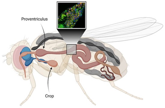 - Miguel-Aliaga, I.; Jasper, H.; Lemaitre, B. Anatomy and Physiology of the Digestive Tract of Drosophila Melanogaster. Genetics 2018, 210, 357–396. [Google Scholar] [CrossRef] [PubMed]