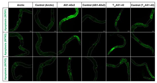 Activation of the apoptotic pathway in the midgut of Drosophila fly-expressing Aβ variants in the enterocytes using the Myo31DF driver: Arctic- (left), Aβ1–42 × 2- (middle) or T22Aβ1–42 (right) flies. In the fluorescence images, the GFP signal (green) is shown, which acts as a sensor of apoptosis. The analysis included three intestines (INTs) for each group, and it was performed at 15-, 21-, and 15-days post eclosion, respectively. The corresponding control flies are shown to the right of each genotype. The white, dotted line outlines the edges of the intestine. Scale bar, 100 μm.
