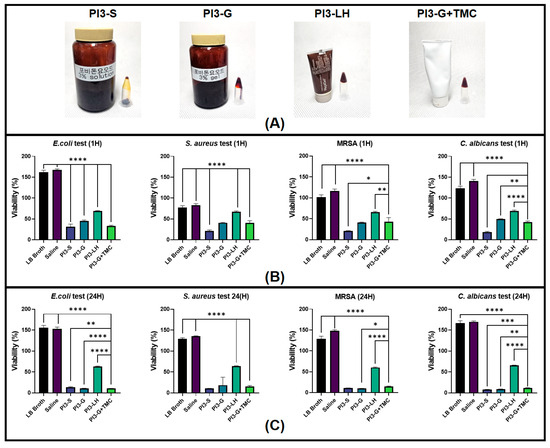 Images of the different Poly(vinylpyrrolidone)-iodine (PVP-I) formulations (A). Viability of bacterial and fungal cultures with the test materials after 1 h (B) and 24 h (C) (n = 6; * p < 0.05; ** p < 0.01; *** p < 0.001; **** p < 0.0001).