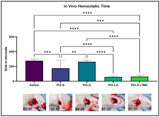 In vivo bleeding experiments testing the hemostatic activity of the different samples. Averaged timing scores of each group indicate that PI3-S and PI3 g were not suitable for stopping the bleeding, while both PI3-LH and PI3-G+TMC were effective in minimizing the bleeding time of a liver puncture (n = 5; ** p < 0.01; *** p < 0.001; **** p < 0.0001).