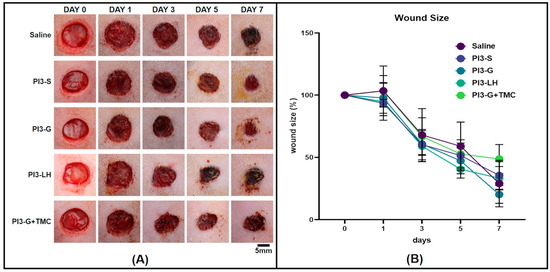 Macro images of the rat full-thickness skin wounds taken over the period of 1 week (A) and averaged percentage measurement of the wound areas per treatment group (B) (n = 4).