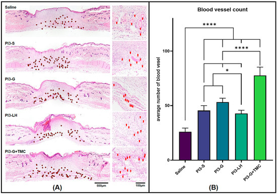 Hematoxylin- and eosin-stained tissue section (A) revealed varied presence of blood vessels within the wound area (Low magnification = red dots; high magnification = red arrows). Histomorphometric count of blood vessels within the wound area (B) indicate the significantly higher presence of blood vessels in PI3-G+TMC-treated wound compared to the other groups (n = 4; * p < 0.05; **** p < 0.0001).