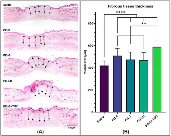 Histological images showing the fibrous tissue formed within the wound bed of the skin defects (A) and histomorphometric measurement of the fibrous tissue thickness (B). Arrows indicate measured cross-sectional lengths (n = 4; ** p < 0.01; **** p < 0.0001).