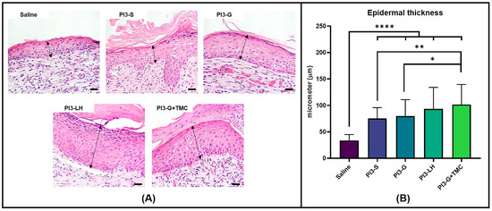 Another histological parameter compared among the treatment groups was the thickness of the regenerated epidermis. In Figure 6A, representative images of the regenerated epidermis from different treatment groups are displayed. The regenerated epidermis was defined as the epidermal tissue directly above the fibrous tissue, which does not extend beyond the edges of the wound bed. Unsurprisingly, routine treatment with normal saline solution had little effect on the development of thick regenerated epidermis; however, the application of the antiseptic agents generally resulted in the formation of thicker epidermal tissue within the wound area. The cross-sectional measurements in Figure 6B show that, on average, the routine application of PI3-LH (93.24 µm) and PI3-G+TMC (101.58 µm) led to a thicker regenerated epidermis compared to both PI3-S (75.25 µm) and PI3 g (79.76 µm).
