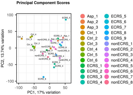 PCA was conducted across all groups (Table 1), indicating distinct segregation for the control group, while no significant differences were found among ECRS, Asp, and nonECRS (Figure 1).