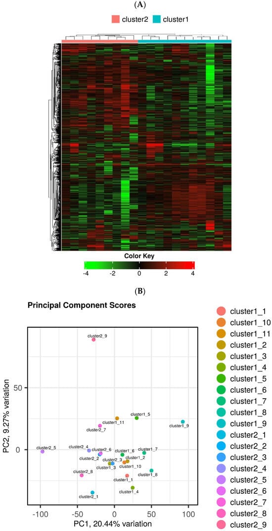 Hierarchic cluster analysis with all CRSwNPs segregated into two clusters (clusters 1 and 2) (A). The segregation into two clusters and the comorbidity of asthma were not correlated. The new clusters and control showed clear separation in the PCA analysis (B).