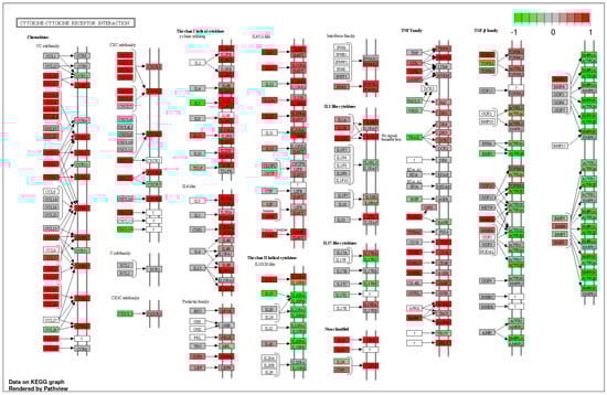 KEGG pathway analysis of cluster 1 vs. cluster 2 in “cytokine-cytokine receptor interaction” by iDEP1.13. Red represents the upregulated DEGs and green represents the downregulated DEGs in cluster 2 compared to cluster 1. The intense result of DEGs including upregulation of interleukin (IL)-4 like cytokine, chemokine (C-C motif) ligand (CCL) 26, and leukotriene B (LTB) suggests that cluster 2 is characterized by severe type 2 inflammation. ? indicates probably unknown.
