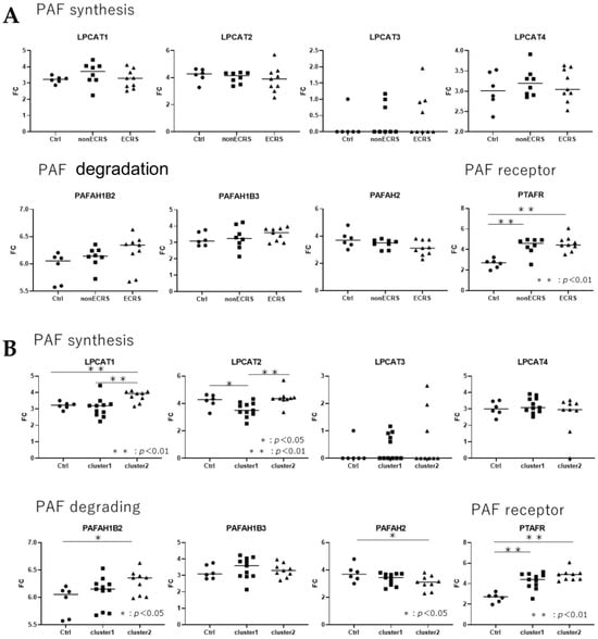 PAF-metabolism-associated gene expression (FC: fold change) in clinical classification with JESREC criteria (A) and clusters according to severity of type 2 inflammation (B). Clinical classification showed no clear difference among the phenotypes of CRSwNP, but the cluster endotype of CRSwNP demonstrated clear differences in PAF-metabolism-associated gene expression.