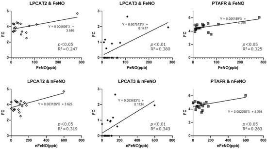 PAF-metabolism-associated gene expression (FC: fold change) in CRSwNPs based on the test of FeNO and nFeNO. FeNO and total nFeNO correlated with LPCAT2, LPCAT3, and PTAFR expressions using the Pearson correlation coefficient, but all data demonstrated low R2 in linear regression analysis. FeNO, oral fractional exhaled nitric oxide; nFeNO, total nasal FeNO.