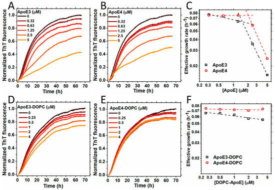 Aggregation of S100A9 in the presence of ApoE isoforms in lipid-free and lipidated forms. (A,B) Aggregation kinetics of 50 µM S100A9 in the presence of increasing concentrations of (A) ApoE3 and (B) ApoE4. The concentrations of ApoE isoforms used here are 0; 0.32; 0.63; 1.25; 2.5; and 5 μM. (C) The effective growth rate of ApoE3 (black dashed line and squares) and ApoE4 (red dashed line and circles) were obtained from the half-time values in (A,B), respectively. The dashed lines are to guide the eye. (D,E) Aggregation kinetics of 50 µM S100A9 in the presence of an increasing concentration of lipidated forms of ApoE isoforms, i.e., (D) ApoE3-DOPC and (E) ApoE4-DOPC, respectively. The concentrations of ApoE isoforms used here are 0; 0.25; 0.5; 1; 2; and 4 μM. (F) The effective growth rate of ApoE3-DOPC (black dashed line and squares) and ApoE4-DOPC (red dashed line and circles) are obtained from the half-time values in (D,E), respectively. The dashed lines are to guide the eye. The reaction is performed in PBS buffer containing 1 mM sodium azide at 42 °C in non-stirring conditions. A total of 20 μM ThT is used to monitor the aggregation kinetics.