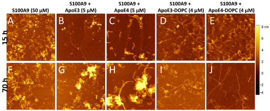 To monitor the changes in amyloid morphology, AFM imaging was performed on S100A9 samples in the absence and presence of ApoE isoforms after 15 and 70 h incubation (Figure 2A–J). S100A9 alone formed long, flexible fibrils up to a micron length after 70 h, which tended to intertwine into large tangles (Figure 2A,F and Supplementary Figure S3F). The height of the fibrils in the AFM cross-sections was approx. 1 nm (Supplementary Figure S3A). In the presence of 5 μM lipid-free ApoE3, the fibrils were short (~0.25 µm), as shown in Figure 2B,G, and Supplementary Figure S3G, and had a height of around 1.5 nm, as shown in Supplementary Figure S3B. We observed also the clumping of aggregates in certain areas, which were ~8–10 nm in height in the AFM cross-sections. These might be the aggregates of ApoE3 together with S100A9 fibrils, as their morphology was similar to ApoE aggregates alone, as shown in Supplementary Figure S4. In the presence of lipid-free ApoE4, we found aggregated clusters similar to those observed for S100A9 with ApoE3 (Figure 2C,H). The fibrils of S100A9 formed in the presence of 5 μM ApoE4 had similar cross-section heights of 1.5 nm (Supplementary Figure S3C) to those formed in the presence of ApoE3, but the fibrils were longer compared to the ones formed in the presence of ApoE3, as shown in Supplementary Figure S3H. These observations also suggest that ApoE3 is a more potent inhibitor than ApoE4, which corroborates our kinetic analysis.