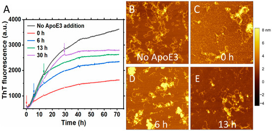 Inhibitory effect of ApoE3 on S100A9 amyloid formation persists irrespectively of the time when it is added during the growth phase of aggregation. (A) Aggregation kinetics of 50 μM S100A9 alone is shown in black, with the addition of 5 μM ApoE3 in the beginning of aggregation is shown in red, after 6 h aggregation is shown in blue, after 13 h – in green, and after 30 h – in purple, respectively. The arrows in the figure indicate the time points that ApoE3 was added during S100A9 amyloid formation. A total of 20 μM ThT was used to monitor the aggregation kinetics. (B–E) AFM images of S100A9 amyloids with and without ApoE3 at the end of aggregation after 70 h. (B) Corresponds to S100A9 aggregation without ApoE3, (C) ApoE was added at 0 h, (D)—at 6 h, and (E)—at 13 h, respectively. The reaction was performed in PBS buffer containing 1 mM sodium azide, pH 7.4, 42 °C, and in non-shaking conditions. Scan sizes are 2 × 2 μm. The z-scale in AFM images is indicated by a bar with a color gradient from black to white.
