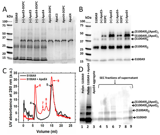 In order to examine further the interactions of S100A9 with ApoE isoforms during aggregation, we aggregated 100 μM S100A9 and 5 µM lipid-free ApoE4 for 70 h and centrifuged the sample to obtain the pellet and supernatant (Figure 4C,D). The supernatant was then subjected to size exclusion chromatography followed by SDS-PAGE. The protocol is shown in Supplementary Figure S6A. As shown in Figure 4C, when only the supernatant of S100A9 was subjected to the Superdex 200 column, we observed two major peaks. One came in the void volume (Peak 4), and the second came at the position of native S100A9, i.e., at 15 mL (Peak 5). When the pellet, as well as the gel filtration fractions, were subjected to Western blot, two bands corresponding to 13 kDa monomer and the 26 kDa dimer of S100A9 (Figure 4D, Lanes 1, 4 and 5, respectively) were observed. In the presence of ApoE4, we found two extra peaks in the 11 and 12 mL fractions from the gel filtration column (Peaks 7 and 8), respectively, apart from a peak in void volume (Peak 6) and the 15 mL fraction (Peak 9), which corresponded to larger particles and native S100A9, respectively. In the Western blot analysis, we observed the bright band of the ~50 kDa S100A9–ApoE complex in the pellet fraction (Lane 2) and the corresponding faint band in the void volume (Lane 6) in Figure 4D. We did not observe this band in other samples due to their larger dilution.