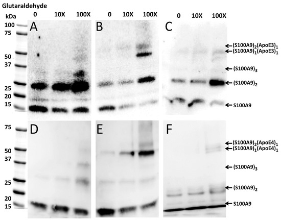 Complex formation of native S100A9 with ApoE3 and ApoE4 isoforms, respectively, observed by Western blot in the presence of increasing concentrations of glutaraldehyde. Western blot of (A) 4 μM S100A9 alone; (B) 4 μM S100A9 in the presence of 4 μM ApoE3; (C) 4 μM S100A9 in the presence of 4 μM ApoE3-DOPC; (D) 4 μM S100A9 alone; (E) 4 μM S100A9 in presence of 4 μM ApoE4; and (F) 4 μM S100A9 in presence of 4 μM ApoE4-DOPC. Western blots shown in panel (A–C) were performed by using anti-S100A9 polyclonal antibodies produced by Invitrogen, while those in panel (D–F) were performed by using anti-S100A9 antibodies from Santa Cruz. Increasing concentrations of glutaraldehyde from 0 to 10X and 100X are shown above the Western blots. The bands characteristic of S100A9 and S100A9–ApoE complexes and corresponding to all aligned blots are marked on the right side from the blots shown in (C,F).