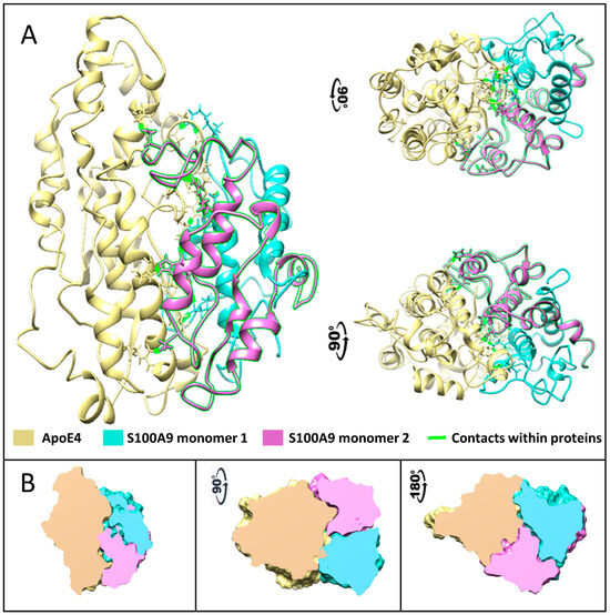 Complex formed between native S100A9 and ApoE4 calculated using multiscale MD simulation. (A) The protein structures are shown by ribbon backbone models in three orientations to highlight the mirror symmetry of S100A9 dimer in the complex with ApoE4. ApoE is shown in yellow, one S100A9 monomer is shown in sea blue, and another in pink. Amino acids that form contacts are shown as sticks with contacts highlighted in fluorescent green. (B) The cross-sections through the Connolly surfaces are used in the same three orientations to show the size and shape of protein–protein contact surfaces, illustrating large interaction surfaces and the related symmetry within the complex. ApoE is shown in yellow, one S100A9 monomer is shown in sea blue, and another in pink. The color coding of interacting proteins as in (A).