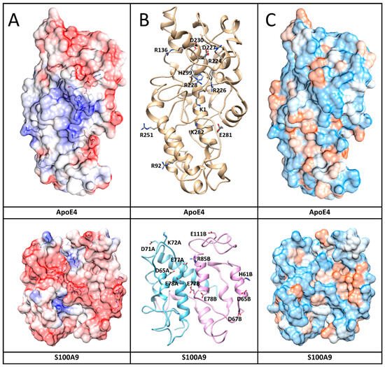 To further investigate which amino acid residues of ApoE3 and ApoE4 interact with S100A9, we performed molecular docking and MD simulation. The structures and interactions of the S100A9 dimer with the ApoE4 monomer were described by using a combination of the molecular docking based on a coarse-grained simulation for 20 μs (Supplementary Figure S9) and an all-atom MD simulation for 300 ns (Figure 6) [38]. Molecular docking was used for the initial search of the binding sites of ApoE4 to the S100A9 dimer (Supplementary Figure S9) [39]. Both proteins are compact without significant cavities or crevices on their surfaces. ApoE4 has relatively loose loops at the N- and C-termini, which form initial contacts with the S100A9 dimer. MD analysis revealed that ApoE4 has a diagonal ridge with positively charged Arg and Lys residues, including R92, R136, R226, R228, R251, K282, and H299, while S100A9 has a negatively charged diagonal ridge, including residues D65A, D71A, E77A, and E78A of the monomer denoted as A, and D65B, D67B, E77B, E78B, and E11B of the S100A9 monomer denoted as B (Figure 7). These amino acid residues provide specific donor–acceptor interactions within the complex. It is interesting to note that the dimer of S100A9 shows symmetrical projections involved in the complex with the ApoE4 monomer. The donor–acceptor bonds between the monomer ApoE4 and the dimer S100A9 are summarized in Supplementary Table S1. Among these pairs, nine donor–acceptor pairs showed above 60% occupancy, indicating that in more than 60% of the frames calculated in MD, these molecular bonds were present (Supplementary Figure S10). At the same time, 27 bonds show above 20% occupancy. These indicate that the interactions are dynamic. Most of the Asp and Glu amino acid residues of S100A9 involved in the complex formation with ApoE are in its second EF-hand calcium-binding site (Supplementary Figure S11). Most of the amino acid residues of ApoE involved in the interactions are located in its C-terminus. Since the lipidation of ApoE takes place in its C-terminus, including the amino acid residues of 244–272 [40], this may explain why the lipidated states of ApoE are less prone to form complexes with S100A9.