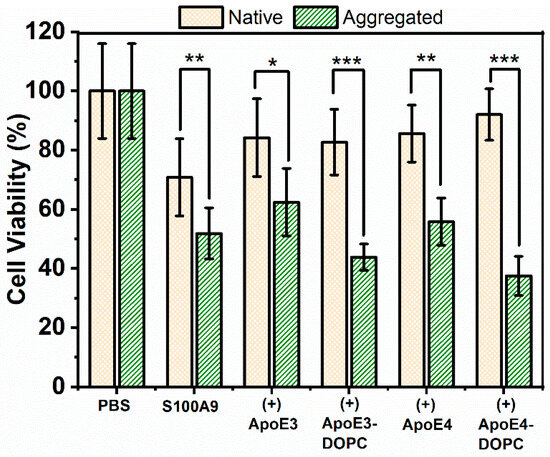 Cytotoxicity of S100A9-ApoE amyloids on SH-SY5Y neuroblastoma cells measured by the MTT assay. Viability of SH-SY5Y neuroblastoma cells was measured after 24 h co-incubation with S100A9 amyloids by monitoring the absorbance of MTT at 570 nm. Yellow bars with crossed pattern correspond to cells treated with S100A9 or S100A9 mixed with ApoE isoforms in the native state, and green bars with dash pattern correspond to cells treated with S100A9 or S100A9 mixed with ApoE in the aggregated state. The native state corresponds to freshly purified 100 μM S100A9 in the presence or absence of 5 μM ApoE mixed just prior to addition to the cells. The aggregated state corresponds to 100 μM S100A9 aggregated for 72 h at 42 °C in the presence or absence of 5 μM ApoE. Different forms of ApoE used in the experiment are shown along the x-axis. The final concentration of S100A9 incubated with cells was 10 μM. T-test was used to calculate p-values: * corresponds to p < 0.05, **—p < 0.01 and ***—p < 0.005.