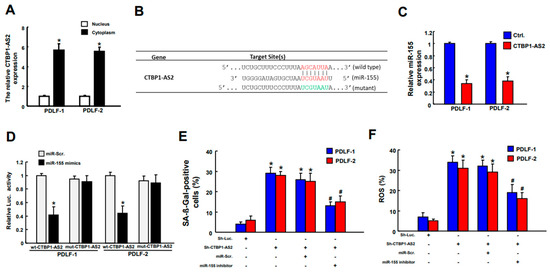 The level of CTBP1-AS2 expression was markedly upregulated in cytoplasm of PDLFs after ErL irradiation (A). The illustration of three prime untranslated region (3′ UTR) of CTBP1-AS2 and miR-155 (B). Transfection of PDLFs with CTBP1-AS2 resulted in a lower mRNA level of miR-155 (C). The luciferase activity of Wt-CTBP1-AS2 vector was reduced when cotransfected with miR-155 mimics, whereas no significant change was present in the mut-CTBP1-AS2 vector in PDLFs (D). When miR-155 inhibitor was introduced, the increased cell senescence (E) and ROS levels (F) were reversed. * p < 0.05 compared to control group/miR-Scr. only group; # p < 0.05 compared with sh-CTBP1-AS2+miR-Scr. group.