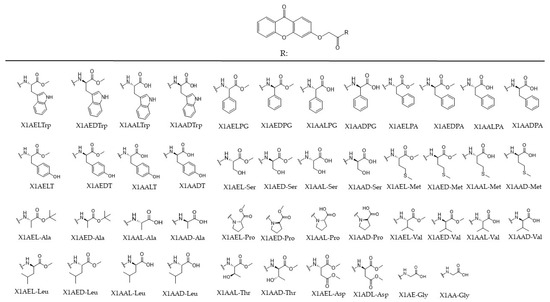 Library of synthesized CDXs. R corresponds to the substituent conjugated with the xanthone scaffold. X1—xanthone; AE—amino ester; AA—amino acid; the letters D and L correspond to the configuration of the enantiomers, respectively. The amino ester and acids used in conjugation were: Trp—tryptophan, PG—phenylglycine, PA—phenylalanine, T—tyrosine, Ser—serine, Met—methionine, Ala—alanine, Pro—proline, Val—valine, Leu—leucine, Thr—threonine, Asp—aspartic acid, Gly—glycine.