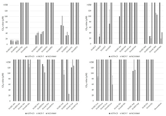 Effect of chiral derivatives of xanthones (CDXs) on tumor cancer cell growth, evaluated based on the respective GI50 value (in µM). The cell lines used in this assay were A375-C5 (melanoma), MCF-7 (breast cancer), and NCI-H460 (non-small lung cancer). The amino acids used in conjugation were as follows: Asp—aspartatic acid, Ala-alanine, Gly—glycine, Leu—leucine, Met—methionine, PA—phenylalanine, PG—phenylglycine, Ser—serine, Val—valine, Pro—proline, Thr—threonine, T—tyrosine, Trp—tryptophan.