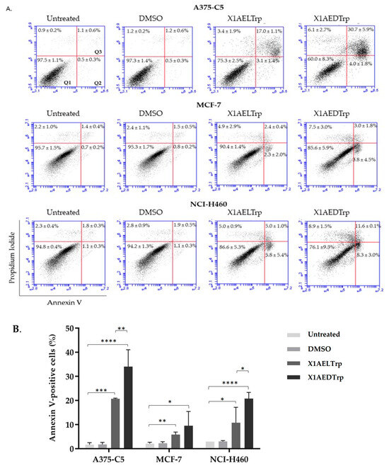 To gain insights into the cytotoxic mechanism by which X1AELTrp and X1AEDTrp exert their antitumor effect, the A375-C5, MCF-7, and NCI-H460 cancer cells were treated with these compounds for 24 h at concentrations corresponding to 2-fold the GI50 values previously obtained, and the cells were observed under phase contrast microscopy. Untreated and DMSO-treated cells were included as controls. The presence of wrinkled and detached cells was observed, which was more evident after X1AEDTrp treatment, suggesting cell death (Figure 4). Accordingly, cells were collected, and Annexin V/PI staining was performed and analyzed via flow cytometry to detect apoptosis (Figure 5). In untreated and DMSO-treated cells, the percentage of apoptosis was residual (<5% for all cell lines), as expected. In contrast, a significant increase in apoptotic cells was observed (Figure 4) after treatment with X1AELTrp and X1AEDTrp. As observed under microscopy, the percentage of apoptotic cells was higher after exposure to X1AEDTrp than with X1AELTrp. Overall, these results indicated that X1AELTrp and X1AEDTrp induce cancer cell death via apoptosis and that X1AEDTrp is more potent than its enantiomer X1AELTrp.