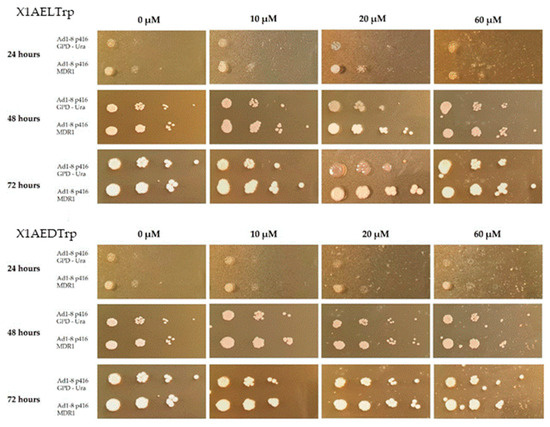 Growth of the S. cerevisiae strains Ad1-8 p416 GPD-Ura and Ad1-8 p416 MDR1 in YPD medium with different concentrations of X1AELTrp and X1AEDTrp (10 μM, 20 μM, and 60 μM), after 72 h of incubation at 30 °C. Untreated cells (0 μM) were used as a control.