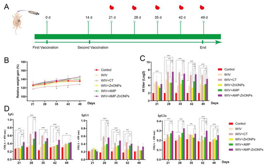 The schedule of immunization strategy (A). Changes in body weight of mice over time (B). * indicates p < 0.05, compared with the control group. HI titers (C), IgG, IgG1 and IgG2a (D) antibodies in mouse serum on 21, 28, 35, 42, 49 days after primary immunization. *, **, *** and ****, respectively, indicate p < 0.05, 0.01, 0.001 and 0.0001, compared with the WIV + AMP-ZnONP group.